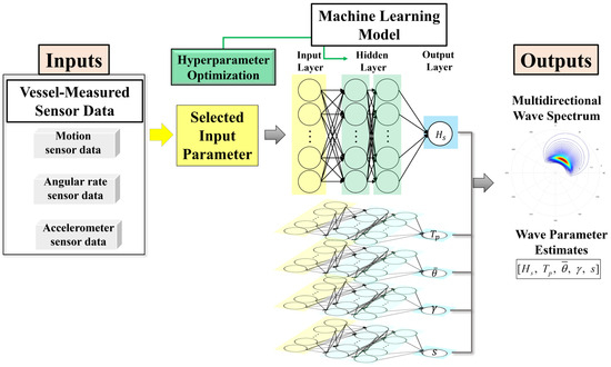 Recently, several studies have proposed machine learning (ML) models for this inverse problem. These methods rely more on data rather than the system’s characteristics. Pioneering studies have explored various aspects of this approach. Firstly, they have considered different input combinations. Reasonably successful wave estimation was achieved using 6 degrees of freedom (6DOF) motions [1,2,3,4,5,6]. Some studies have focused solely on nonplanar motions such as heave, roll, and pitch [7,8,9,10,11]. Despite fewer input parameters, these studies have demonstrated reasonable success in estimating wave conditions, highlighting the critical role of these motions in the inverse problem. Moreover, researchers have attempted various input combinations to enhance ML model performance. Such examples include inputs from 9DOF motions, ship motions with structural responses, a cross-spectrum of ship motion, horizontal/vertical accelerations with pitching motion, heave, surge, and sway displacements, and 6DOF accelerations [12,13,14,15,16,17]. These examples highlight the necessity of selecting appropriate input parameters in inversely estimating wave conditions.