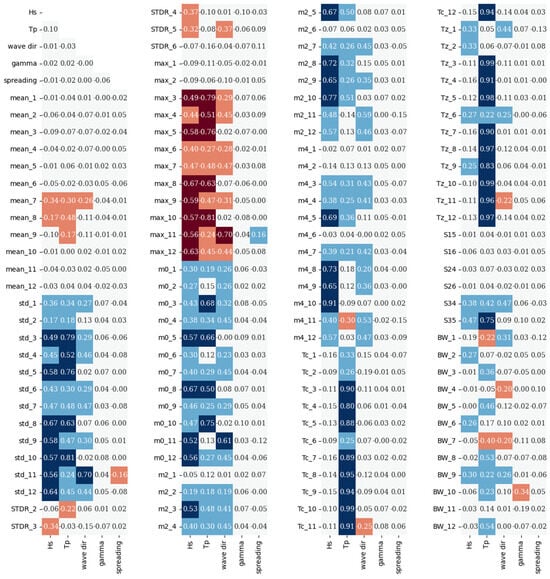Feature correlation heatmap of input variables and wave parameters (in the figure, mean and std stand for mean value and standard deviation; STDR stands for relative standard deviation; m0, m2, and m4 represent the zeroth, second, and fourth spectral moments; , , and BW are the mean crest periods, the mean up-crossing periods, and the spectral bandwidth; the numbers 1–6 represent surge, sway, heave, roll, pitch, and yaw displacements, 7–9 denote angular velocities with respect to the x, y, and z axes, and 10–12 represent x, y, and z accelerations, respectively).