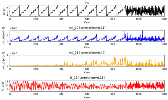 Series plot of 1200 cases— and a large correlation (m4_10: the fourth spectral moments of surge acceleration), median correlation (m4_11: the fourth spectral moments of sway acceleration), and low correlation (_11: crest period of sway acceleration) with , respectively.