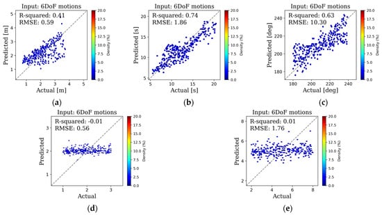 Regression plots for the estimation of each wave parameter using the mean and standard deviation of 6DOF motions as input (the number of inputs = 12) ((a): significant wave height; (b): wave peak period; (c): wave direction; (d): enhancement parameter; (e): spreading factor).