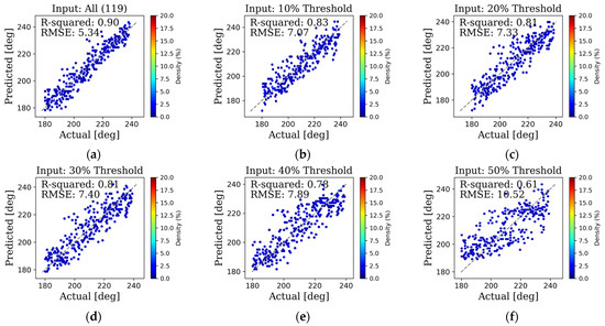 Regression plots for the estimation of main wave direction while applying thresholds to correlations between input and output variables ((a): 119 input variables; (b): more than 10% correlated variables; (c): more than 20% correlated variables; (d): more than 30% correlated variables; (e): more than 40% correlated variables; (f): more than 50% correlated variables).