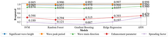 Figure 13 compares the values of wave parameters from five ML models including an ANN. All 119 input parameters were employed in this comparison. SVM, RF, GB, and Ridge Regression exhibit competitive performance across various parameters, showing strengths in distinct aspects such as robustness and the handling of nonlinear relationships. However, the ANN consistently outperforms the other models in the present problem, achieving the highest values for all variables. This superiority can be attributed to the ANN’s capability to capture complex nonlinear patterns, making it particularly advantageous in tasks where intricate relationships exist within the data [34]. Big differences are especially observed in enhancement parameters and spreading factors. Since we randomly selected these parameters in training and testing, these parameters are more challenging and hard to estimate. In this case, the ANN shows superior performance. In summary, while all models show effectiveness, the ANN stands out by producing the best result in this context. Note that different problems can lead to different trends, i.e., depending on the problem, the optimal algorithm can be different.