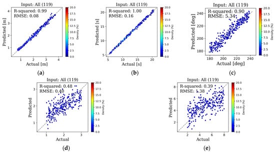This section presents the best results after various sensitivity tests. As explained earlier, the test datasets are randomly generated in the range of 0.75 m < < 3.75 m, 5.5 s < < 20.5 s, 180° < < 240°, 1 < < 3, and 2 < s < 8. Figure 14 shows the regression plots when all 119 input variables are considered. While these results demonstrate that an extensive set of input parameters can lead to very high R-squared values (0.99 for , 1.0 for , and 0.9 for ), it is important to recognize that assembling and processing such a large number of statistical inputs may not be practical. Nevertheless, the analysis provides a valuable benchmark, showing the upper performance limit of the model under idealized conditions. This level of accuracy suggests that the ANN model can, in principle, effectively capture the complex relationships between platform motion data and wave parameters. The estimation of wave main direction indicates a strong correlation between predicted and actual values, indicating the model’s ability to discern wave main direction even in directional-spreading conditions. While the values of the enhancement parameter and spreading factor are lower, they still exhibit reasonable prediction, which seems to be improved compared to earlier research [13].