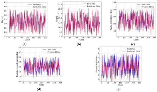 Figure 15 presents direct comparisons of the actual and predicted wave parameters for three hundred test cases. Since an FPSO unit’s downtime is highly related to , the exceedingly high accuracy of exhibits robust practical applicability. Again, the enhancement parameter in the JONSWAP spectrum and the spreading exponent s are randomly selected, making it difficult to identify any correlations with other wave parameters, which explains the relatively low values. In a mild sea environment, the enhancement parameter and the directional-spreading factor s do not induce strong, distinct effects on vessel motions and thus exhibit weaker correlations with the measured signals. Addressing this issue may involve incorporating more energetic wave cases in training data or devising more specialized feature extraction techniques, which we will pursue in future developments of our modeling approach. Nevertheless, there exist rather consistent trends between the actual and predicted values.