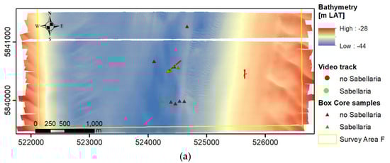 A multi-scale and multi-sensor mapping approach with the combination of a MBES, SSS, ROV video footage, and physical samples (e.g., box cores or Van–Veen grabs) is recommended for a full reef mapping campaign, as it was carried out in [1]. Such an approach provides the full picture of the Sabellaria reef habitat. The MBES provides detailed information about the seabed morphology and sediment distributions [15,16]. The MBES data can then be used to select suitable ground truth location for the ROV and grab sampling as well as to investigate preferred habitat characteristics of the targeted species. The SSS can be used for mapping the distribution of Sabellaria reefs, using the ROV video data to validate the interpretation of the SSS sonar data. Finally, the physical samples provide an accurate representation of the local seabed sediment characteristics and the reef biodiversity.