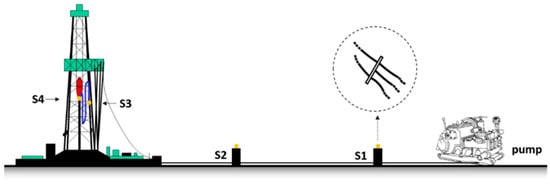 Figure 1 shows a schematic illustration of a typical MPT system with sensors and mud pumps installed. In such a system, the measurements are generally taken by instruments mounted within drill collars above the drill bit, and the drill bit is controlled by electric machines [25,26]. Once generated, the information signal is transmitted uphole to the surface. Then, the ground signal processing unit will analyze the signal. Since the downhole signal is generated remotely from the uphole sensors near the mud pumps, the information signal is overwhelmed by the noise generated by the mud pumps [27,28]. Figure 2 displays the layout of pressure sensors we used in the real field test. There are six sensors that should be used for data measurement, including four pressure sensors (S1–S4) and two pump impulse sensors. The four pressure sensors are distributed along the mud pipelines between the mud pumps and the top drive. Two pump impulse sensors are installed at the switches of the mud pumps, indicating the operating cycle of the mud pump piston, helping to determine the period and start time of the pump noise in the pressure signal, playing a key role in the noise elimination.