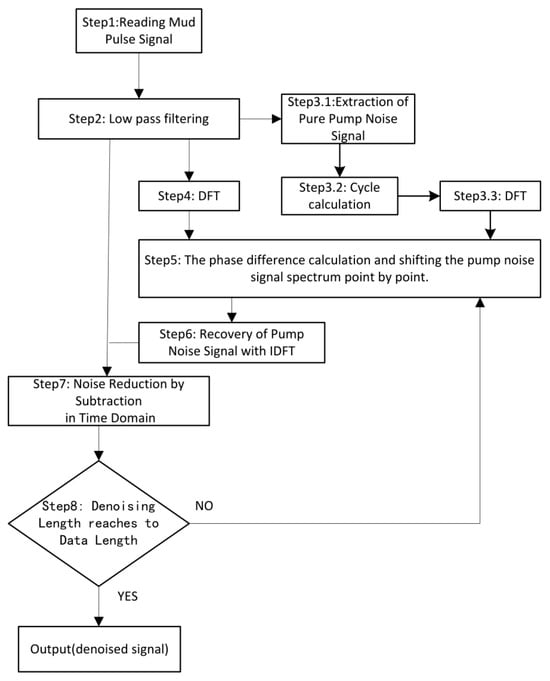 Fourier transform is a tool for converting the time domain to the frequency domain. Signal function and its Fourier transform function are two different forms of the same energy signal. The former shows the time information but hides the frequency signal, and the latter shows the frequency information but hides the time information [38]. Compared with the earlier mentioned scheme using an empirical waveform (standard pump signature), the essential difference in this method is that it maps the similar operation from the original time domain to the corresponding frequency domain through DFT so as to cancel the multi-pump noise in the frequency domain. In this way, it can better solve the problem of the unsatisfactory de-noising effect in some time domains. Compared with the existing schemes using continuous Fourier transform or continuous Morlet wavelet transform, this method can adaptively update the standard pump noise samples point by point in the frequency domain and more accurately eliminate the pump noise. The whole flow chart of the DFT de-noising method is shown in Figure 4, and it mainly includes the following steps: