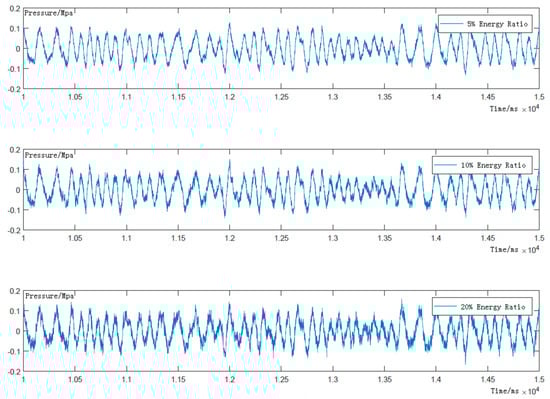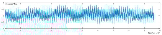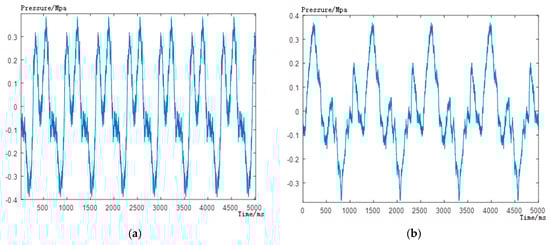 The traditional method for cancelling mud pump noise is explained below. Mud pumps are large positive displacement pumps that generate flow by repeatedly moving a piston back and forth within a cylinder while simultaneously opening and closing the intake and exhaust valves [29]. As a result, the noise generated by the mud pump tends to show a certain pattern of periodicity [30,31]. Consequently, a typical drilling mud pressure pattern, referred to as the standard pump signature, can be obtained by averaging pump signatures over multiple pump cycles [32]. Specifically, the acquisition of the standard pump signature is better accomplished in the absence of the information signal to avoid its impact on the mud pressure. When the MWD data signal is provided, the mud pump cycles are tracked using a pump stroke signal such that the pressure caused by the pump can be subtracted from the received signal in the time domain to provide the intact information signal [33,34,35].