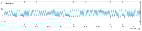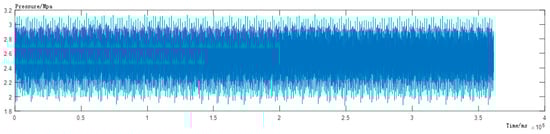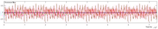 In order to test the applicability of the proposed DFT method in this paper, a simulation test was designed to demonstrate its performance. The two pumps’ noise data used in the simulation are random periodic synthetic noise. The simulated pump noise waveforms are shown in Figure 5. The frequency of the first pump noise (Figure 5a) is 1.5 Hz, and the frequency of the second pump noise (Figure 5b) is 0.7 Hz. The information signal is a sequence of random data modulated using binary frequency shift keying (BFSK), and the signal amplitude is 0.2 Mpa. The symbol rate is 12 bit/s, and the sample rate is 1000 Hz. After mixing the pump noise and the signal and adding random Gaussian noise, the received signal at the sensor is formed, as presented in Figure 6. It can be seen that the information signal is entirely submerged by the pump noise. The output result after de-nosing using the proposed DFT method is presented in Figure 7, where the information signal is recognizable. In order to show the results more clearly, Figure 8 compares the frequency spectra of the input signal (blue, Figure 6) and the output signal (red, Figure 7). It indicates that the main peak amplitude of the mud pumps’ noise has been reduced by more than 85%. Moreover, Figure 9 compares the pure pump noise block of the recovered signal (blue, part of Figure 7) with that of the input signal (red, part of Figure 6), demonstrating that the majority of mud pump noise has been successfully eliminated. Hence, the simulation results prove that the noise cancellation method based on DFT is effective.