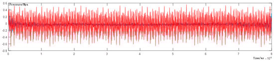Before logging, to validate the scenario of two pumps operating at different frequencies, their pure pump noise was sent at the wellhead and collected on the surface, the working frequencies of these two pumps were 0.6 Hz and 1.4 Hz, respectively, and their flow rates were nearly 2   m 3 / m i n . The signals received by the sensors were sent to a computer for noise cancellation. The information signal was modulated using the BFSK modulation mode with a symbol rate of 12 bits/s and a sampling rate of 1000 Hz. The experiment results are illustrated in the following figures (Figure 12, Figure 13, Figure 14 and Figure 15). After mixing the real pump noise and the information signal, Figure 12 displays the received pressure signal. It is evident that the original signal is completely submerged by the pump noise and is hard to recognize. Figure 13 displays the output results after de-noising using the DFT method and shows a clearer and more observable pattern of the original signal. Similarly, Figure 14 compares the frequency spectrums of the original signal (blue, Figure 12) and the output signal (red, Figure 13) and indicates that the main peak amplitude of the mud pumps has been reduced by more than 80%. Figure 15 compares the pure pump noise block of the recovered signal (blue, part of Figure 13) with that of the input signal (red, part of Figure 12), demonstrating that the amplitude of the pump noise is nearly zero, consistent with the simulation test results.