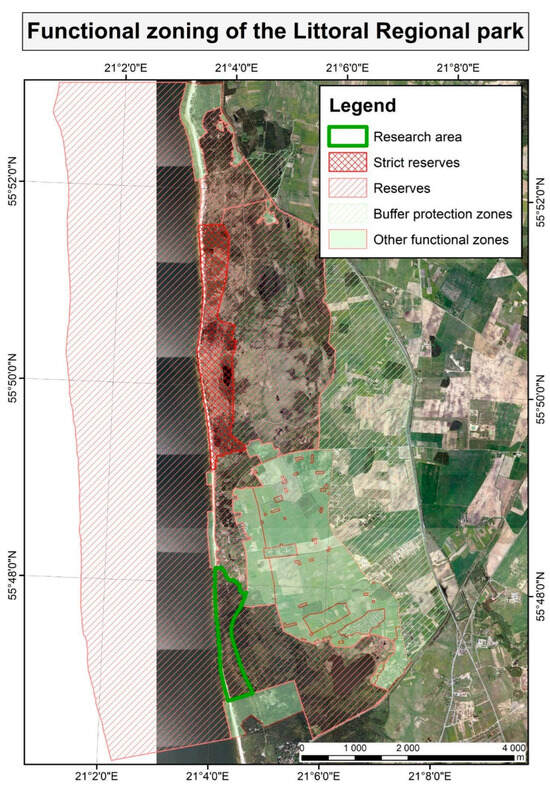 GIS map of functional zoning of the Littoral Regional Park. The delimitation of the Olandų Kepurė landscape reserve is marked with a green line.