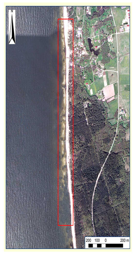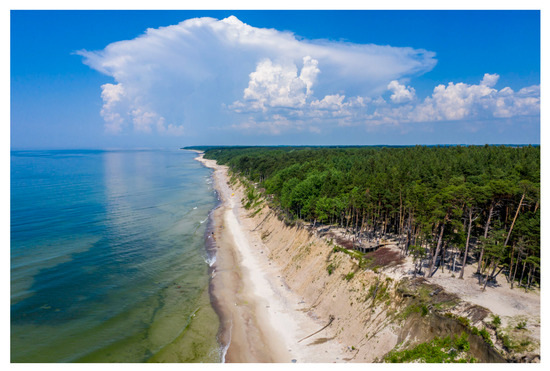 The Olandų Kepurė sea cliff is a 1.5 km long stretch of the Baltic Sea coast north of Klaipeda, the third-largest urban agglomeration of Lithuania (Figure 4). It is the most popular single-day outdoor active visitor attraction on the Lithuanian Baltic Sea coast. A total of 0.4 million visitors annually visit the cliff. One of the essential management tasks of the Olandų Kepurė landscape reserve is to optimize tourism infrastructure to allow visitors to enjoy the park’s natural and cultural heritage values combined with coastal and maritime tourism. Therefore, it is necessary to investigate the cliff behavior in the relatively calm seasons more appealing to visitors.