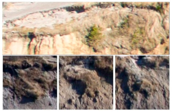 The chosen strategy was to start flying from an altitude of 70 m, gradually reducing it to 40 m and 25 m. Since the Olandų Kepurė cliff height reaches 25 m, the minimum flight height of 25 m was reasonable. During each test flight, at least 25 test images were taken. We further assessed the visual quality of the obtained images. Considering that cliff scarp slumps and base cavities might be 1 m in diameter, it was decided to use the flight height of 25 m for further image database collection. The visual wavelength spectrum was applied in the UAV surveillance. We conducted the surveillance flights to collect the image database after the storm events on 3 March 2023, 7 April 2023, and 24 August 2023.