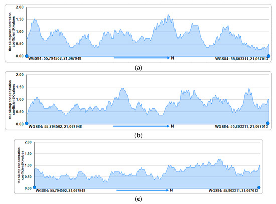 Despite the visually ostensible, quite regular spatial distribution pattern apparent in Figure 6, the distribution of slumps in the study area is far from uniform. The erosion site concentration coefficient K, describing the occurrence of slumps along the Olandų Kepurė cliff scarp, varies significantly, ranging from 0.27 to 1.73 (Figure 8). Regardless of the season, the spatial distribution of slumps along the Olandų Kepurė cliff scarp is very uneven—several investigated cells in the north (on the right in Figure 8), where the cliff is the lowest, feature only a few slumps, i.e., K was equal to 0.27.