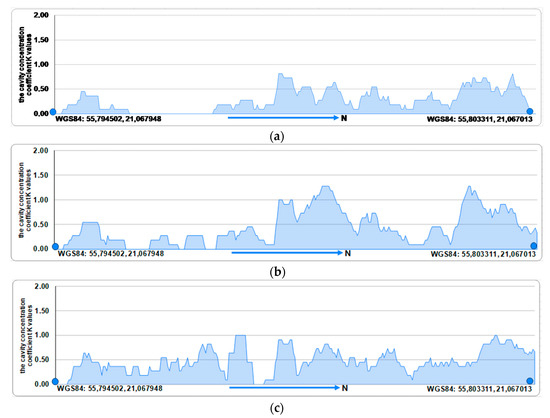Spatial distribution of the cavity concentration coefficient K values along the Olandų Kepurė cliff: (a) 3 March 2023; (b) 7 April 2023; (c) 24 August 2023.