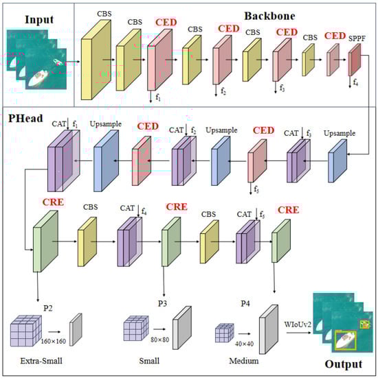Figure 1 illustrates the overall structure of the CFSD-UAVNet model introduced in this paper, which consists of two main components: the Backbone and the PHead. The Backbone consists of a lightweight CED module, CBS convolutions, and SPPF. The input features are initially processed, and feature extraction is performed using consecutive CBS modules, followed by further enhancement of feature representation through alternating CED modules. After multiple layers of processing, the model generates four sets of multi-scale feature maps, f1, f2, f3, and f4. Finally, the SPPF module integrates deep features to capture global contextual information, providing support for subsequent operations. The PHead structure then further enhances the model’s capacity to detect small objects through hierarchical processing and feature fusion. First, the resolution of deep features is progressively restored through three upsampling layers, which are concatenated with shallow features from the Backbone, thus fully integrating spatial and semantic information from different levels. After each feature concatenation, the feature maps of the detection layers are further focused using the CRE module, allowing the model to pay more attention to small objects. The resulting feature maps from the three detection layers are input into three detection heads, P2, P3, and P4, corresponding to the detection of targets at different scales. P2 focuses on detecting smaller targets, while P3 and P4 handle the detection of both small and medium-sized targets. This multi-scale detection mechanism effectively adapts to the significant variation in target size in UAV-based maritime scenarios. Additionally, the model incorporates the WIoUv2 loss function, which optimizes the accuracy and robustness of bounding box predictions. Overall, CFSD-UAVNet, through feature extraction and multi-scale fusion, forms a highly efficient model for UAV-based maritime small object detection, providing a solution for maritime small object detection tasks.