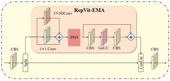 To improve the UAV’s ability to detect small targets in challenging maritime environments, the improved RepViTBlock module [26] is integrated into the detection layer and combined with the CSP structure [27], forming an attention-based lightweight CSP-RepViT-EMA (CRE) module, as shown in Figure 3. This integration further strengthens the model’s ability to recognize and focus on small targets.