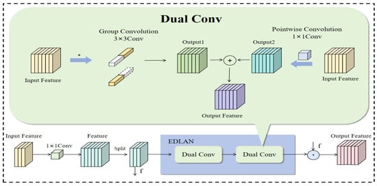 The core of CED lies in the EDLAN structure, which is primarily composed of Dual Conv [31]. This convolutional structure enables efficient extraction of both local and global features of small maritime targets, leveraging the strengths of group convolution and pointwise convolution. Group convolution reduces computational complexity by dividing the input feature map into several groups and performing convolution operations on each group independently. This operation focuses on capturing fine-grained local features of small maritime targets, such as ocean waves, sunlight reflections, and edge information of small objects. Pointwise convolution is then applied to refine local features and merge them into global semantic insights, maintaining comprehensive context across multi-scale features and enriching the diversity of feature representations. The output features of Dual Conv are obtained by performing an addition operation that combines the local feature information from pointwise convolution with the global contextual features from grouped convolution. This convolutional operation facilitates the capture of unique textures and dynamic characteristics in maritime scenes, such as wave patterns, vessel contours, and the locations of persons overboard. The EDLAN structure stacks two Dual Conv layers together, enabling progressive extraction and fusion of small target features across multiple levels, resulting in efficient and lightweight deep feature representations.