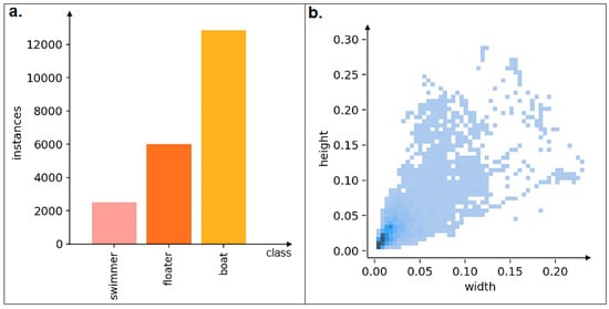 Category quantity and size of the SeaDronesSee Dataset. (a) Bar chart of the number of samples per category. (b) Scatter density plot of width and height distribution.