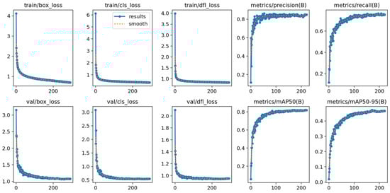 On the SeaDronesSee dataset, as shown in Figure 6, the box_loss, the cls_loss, and the dfl_loss curves for the proposed CFSD-UAVNet model on both the training and validation sets demonstrate its excellent convergence characteristics. In the initial phase, the loss curves exhibit a clear downward trend, followed by a stabilization period, with fluctuations within a narrow range. This reflects that the CFSD-UAVNet model not only learned the features of the dataset but also maintained stability during the learning process, avoiding overfitting and underfitting. This robust loss reduction and stable performance demonstrate the efficient fitting ability of the CFSD-UAVNet model for maritime small object detection. As training progresses, the model’s precision, recall, and mAP indicators show improvement. The rapid growth of precision and recall, followed by a period of gradual increase and eventually stabilizing at a high level, not only showcases the model’s learning capacity but also reflects its reliability in object detection tasks.