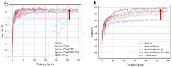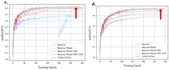 Ablation experiment comparison curves for different metrics. (a) Precision, (b) recall, (c) mAP@50, (d) mAP@95. The red arrow indicates the position of the proposed algorithm CFSD-UAVNet in the figure.