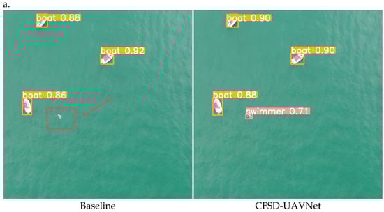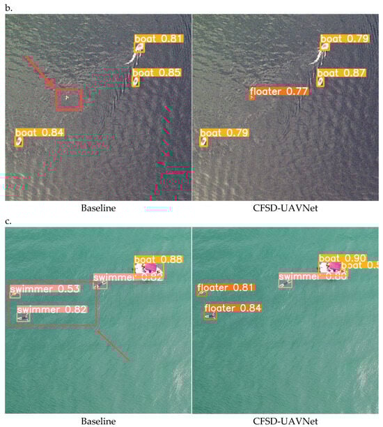 The ablation experiment results comparing the baseline and CFSD-UAVNet models on the SeaDronesSee dataset are visualized in Figure 8. In Figure 8a, the CFSD-UAVNet algorithm demonstrates good performance under the challenging task of multi-class object recognition, accurately distinguishing various targets with enhanced recognition accuracy and robustness. In contrast, the baseline model exhibits missed detections. In the high-altitude images shown in Figure 8b, CFSD-UAVNet can handle the dual challenges of complex sea surface textures and blurred small target edges, precisely capturing the floater category, with an improvement in recognition accuracy, while the baseline fails to detect the floater category. In the UAV perspective images presented in Figure 8c, the baseline incorrectly classifies the floater category as swimmer, whereas CFSD-UAVNet correctly identifies all targets without false positives or missed detections, showcasing its recognition capability for specific targets. Combining the results from Figure 8a–c, it is evident that CFSD-UAVNet excels across varying heights and image clarity conditions, demonstrating its performance and adaptability in small object detection in complex maritime environments. However, further investigation is required to evaluate its performance under varying lighting and weather conditions.