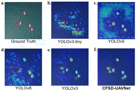 To evaluate the relative impact of the attention mechanism within the proposed CRE module, we visualized the detection results of five models, YOLOv3, YOLOv3-tiny, YOLOv5, YOLOv8, and CFSD-UAVNe, using heatmaps, as shown in Figure 9. Specifically, Figure 9a represents the ground truth, Figure 9b is the heatmap of YOLOv3-tiny, Figure 9c is the heatmap of YOLOv5, Figure 9d is the heatmap of YOLOv8, Figure 9e is the heatmap of YOLOv3, and Figure 9f is the heatmap of CFSD-UAVNet. In these heatmaps, the intensity of the color indicates the model’s level of attention to specific regions of the image during object detection. It can be observed that YOLOv3-tiny, YOLOv5, YOLOv3, and YOLOv8 exhibit little or no attention to the two floater-class objects within the red bounding box in the heatmaps. In contrast, CFSD-UAVNet accurately focuses on these small maritime targets. Additionally, as illustrated in Figure 9b, YOLOv3-tiny erroneously directs attention to background regions of the sea (in the yellow box), whereas CFSD-UAVNet effectively mitigates such background interference. The integration of the EMA attention mechanism enhances the representation of object features, thereby improving the model’s perceptual capability for these targets.