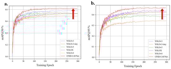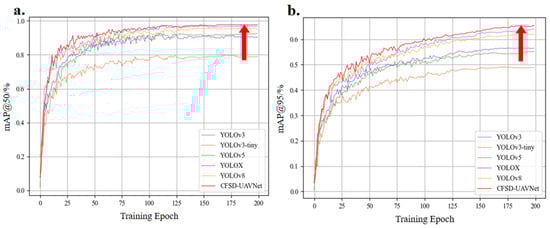 Comparison of mAP curves for selected algorithms in the comparison experiment on the MOBDrone dataset. (a) mAP@50, (b) mAP@95. The red arrow indicates the position of the proposed algorithm CFSD-UAVNet in the figure.
