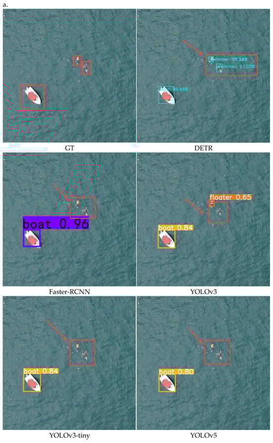 Figure 12b depicts a low-brightness scenario with a darker sea surface, where blurred target boundaries and low contrast increase the detection challenge, particularly for closely positioned targets. The image includes one boat, two floaters, and two swimmers. DETR, YOLOv3-tiny, and YOLOv5 exhibit category misclassification errors for the floater and swimmer classes, likely due to their weak ability to distinguish blurred target features in low-light conditions. Faster-RCNN shows overlapping bounding boxes for the floater category, which may result from interference in boundary feature extraction by its feature extraction network. YOLOv3 and YOLOv8 detect only one floater, indicating their limitations in detecting weak-feature targets in multi-object scenarios. In contrast, CFSD-UAVNet correctly detects and classifies all targets, further validating its robustness and adaptability to blurred boundaries in low-brightness and complex backgrounds.