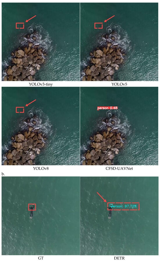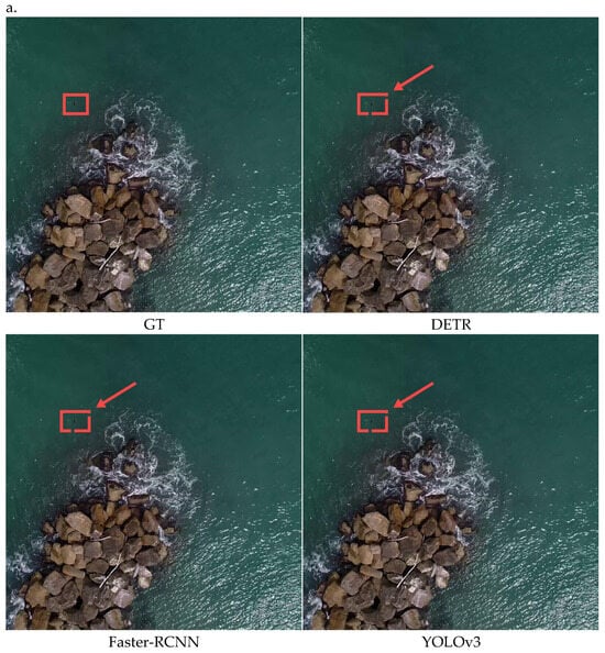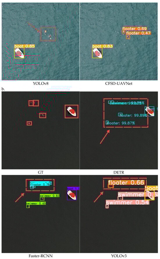 Visualization results of comparison experiment on the MOBDrone dataset. (a) A high-altitude UAV image with a complex, natural background; (b) a UAV image with a distant open-sea background. The red arrow and dotted square in the figure indicate cases of missed or false detections by the comparison algorithm.