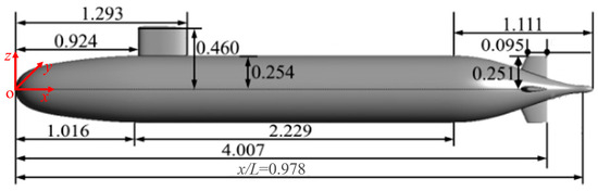 Considering that there are no currently publicly disclosed experimental results for the hydrodynamic pressure field and wake field of the same UV, the numerical methods used in this study for the hydrodynamic pressure field and wake field were validated separately with publicly available experimental results to ensure their reliability. For the validation of the hydrodynamic pressure field, model C in reference [23] was adopted. This model is a simple rotary body with a length of L = 2.4 m and a width of B = 0.2 m. For the validation of the wake field, DARPA SUBOFF AFF-8 with a large amount of publicly available experimental data was used. This model was built by the David Taylor Research Center (DTRC) in the United States. Countries have conducted a large number of experimental studies on DARPA SUBOFF [24,25], which can be used for the validation of the wake field numerical method. The actual DARPA SUBOFF has a total length of 104.5 m, and a reduced model with a scale of 1:24 was adopted to obtain a fully appended model of AFF-8. The full-size length of the hull is L = 4.356 m, the parallel middle body length is 2.229 m, the maximum radius of the hull is R = 0.254 m, the chord length of the sail is 0.386 m and the height is 0.206 m, and the upper part is a convex top cover. The four tail fins are symmetrically arranged in the tail of the model, and the profiles are all NACA 0020 airfoils, as shown in Figure 2.