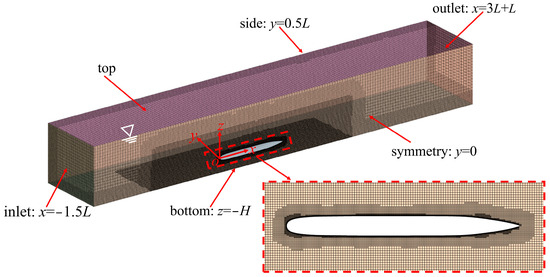 First, model C was employed for research on the accuracy of the hydrodynamic pressure field numerical method. The calculation domain was established, as shown in Figure 3. The upstream inflow boundary is located 1.5 L away from the body, the downstream outflow boundary is 3 L away from the body, and the width of the calculation domain is 1 L. It is assumed that the axis of the body is 0.2 L from the seabed, and the UV moves at a constant depth with a velocity of V = 1.5 m/s (Re = 4.041 × 106). According to the relativity of motion, this velocity is equivalent to the body being stationary, and the inflow is set to flow towards the body at a velocity of 1.5 m/s. The inlet boundary condition is set as the velocity inlet; the outlet boundary condition is set as the pressure outlet; and the top, bottom, and side boundaries are set as the slip wall [26]. Spatial discretization was conducted based on the trimming grid and the prism layer grid, and the positions where the flow field information needs to be captured were intensified. The y+ of the grid boundary layer was changed by adjusting the size of the first-layer grid cell