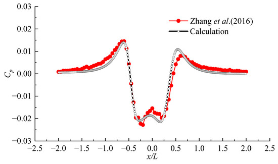 To validate the accuracy of the hydrodynamic pressure field numerical method, the longitudinal pressure curves of the bottom were taken for validation, and the calculated and experimental results were compared [23], as shown in Figure 4. The pressure coefficient Cp is defined as follows: