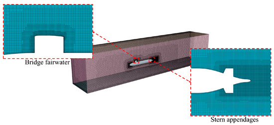 Using the same settings as in Section 3.3, such as the calculation domain, grid, time step, and turbulence model, DARPA SUBOFF was replaced as the calculation model to compare and investigate the differences between the modeling of the hydrodynamic pressure field and the wake field. Considering the different characteristics of wake fields and hydrodynamic pressure fields, based on the previous gridding method, the intersection of the sail and the stern appendage, as well as other appendages with the complex flow of DARPA SUBOFF, was refined. The resulting grid is named Grid 5, and is shown in Figure 5.