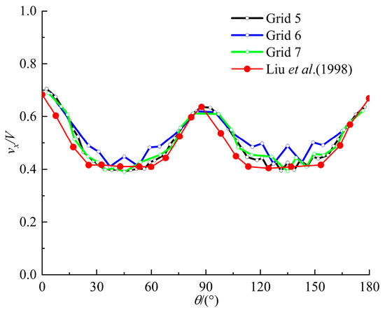 Based on Grid 5, the medium grid, a coarse grid (Grid 6) and a fine grid (Grid 7) were produced for grid convergence verification with a growth rate of . A comparison between on the propeller disk (at x/L = 0.978 in Figure 2) at r/R = 0.25 calculated using three sets of grids and the experimental values [24] is presented in Figure 6. In the figure, is the dimensionless velocity component of the velocity vector in the x-axis direction; R is the maximum radius of the model; r is the radius of the measurement position; the circumferential angle is at the top of the symmetric plane; and the circumferential angle is at the bottom of the symmetric plane.