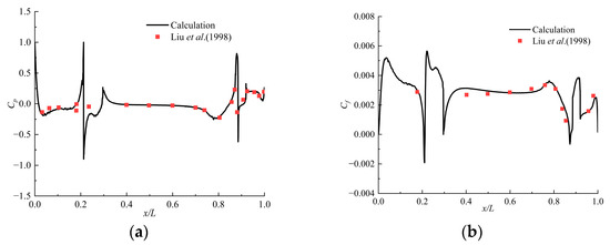 Here, the same Reynolds number Re = 1.2 × 107 was set for calculation as in reference [24]. The comparisons of the pressure coefficient Cp and the skin friction coefficient Cf on the meridian of the hull, the pressure coefficient Cp at 10% and 90% heights of the sail, and the wake velocity components at the propeller disk are presented in Figure 7, Figure 8 and Figure 9, respectively. In the figures, vy and vz are the dimensionless velocity components along the y-axis and z-axis directions, respectively. The skin friction coefficient Cf is defined as follows:
