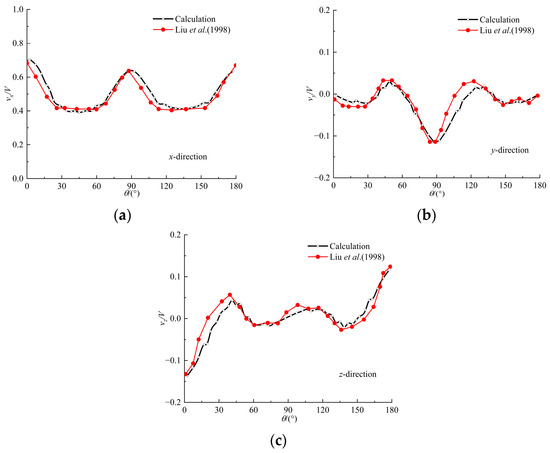 As can be seen from Figure 7 and Figure 8, the calculated and experimental results are in good agreement, except for very few monitoring points near the sail and the stern appendage and other appendages that deviate slightly from the curve. This is because the flow conditions in these positions are complex. Thus, a continuous and dense arrangement of measurement points is needed to capture them. Therefore, it is practical to calculate the wall force using the calculation model in this paper. It can be further seen from Figure 9 that the overall variation trends of the calculated and experimental results are consistent, and there is only a small difference in very few places. For instance, the calculated values exhibit a slight oscillation in the range of 120° to 150° in the x-direction and 130° to 150° in the z-direction. This is because, for the calculation of the wake field, there are still insufficient monitoring points in the complex flow region of this grid. Overall, it can be concluded that this numerical method is reliable for conducting research on wake fields.