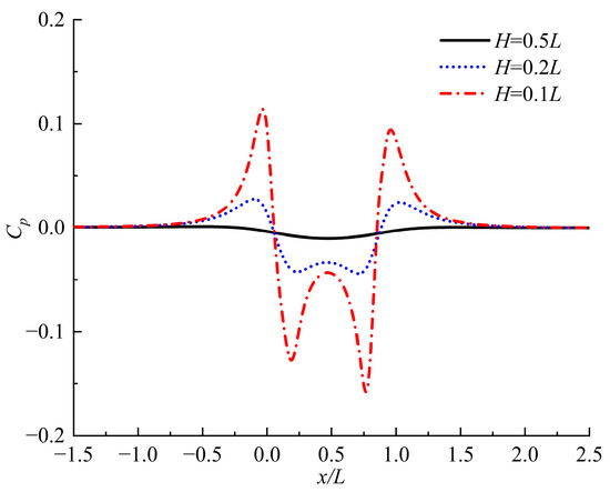 The distribution of the hydrodynamic pressure field at different H is illustrated in Figure 10 and Figure 11. It can be observed from both the two-dimensional and three-dimensional graphs that the influence of the bottom becomes stronger and the shape of the negative pressure region gradually transforms from a single-peak “V” shape to a double-peak “W” shape as H decreases. The reason for this change is that when the UV is advancing with H continuously decreasing, the velocity in the flow field at the bow and stern of the UV suddenly changes, leading to a sharp alteration in the hydrodynamic pressure field; this phenomenon becomes increasingly prominent as H decreases. The positive pressure region of Cp gradually emerges as H decreases. From having no positive pressure area at H = 0.5 L to two positive pressure areas appearing near the bow and stern at H = 0.2 L, the positive pressure peak is slightly smaller than the negative pressure peak. Then, the positive pressure peak increases notably at H = 0.1 L, and the change trend of the positive pressure area becomes steeper.