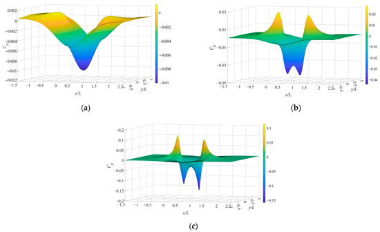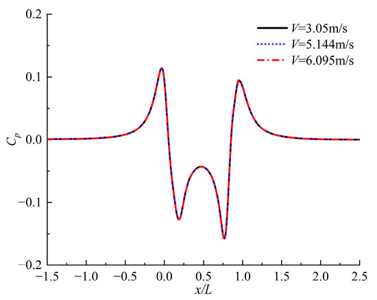 To further investigate the effect of different speeds on the hydrodynamic pressure field, Cp curves for different speeds at y = 0 L are plotted in Figure 13 for different speeds; they are almost identical. Cp is dimensionless pressure, from which it can be inferred that the speed has no effect on the characteristics of the hydrodynamic pressure field.
