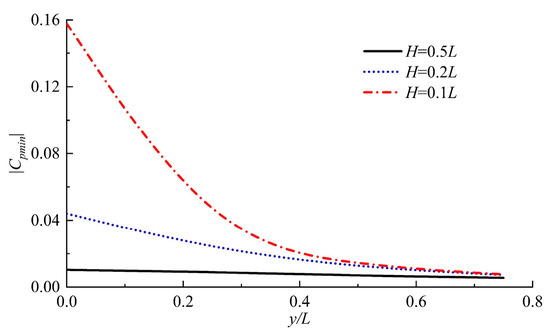 Further studies were carried out on the variation rule of the negative pressure peak |Cpmin| in the hydrodynamic pressure field under different H with y, and the changes in negative pressure peak with depth under different y were analyzed. In the results presented in Figure 12, the negative pressure peaks of the three H of 0.1 L, 0.2 L, and 0.5 L, respectively, show a trend of attenuation with the gradual increase in y; however, the pressure of the near-bottom advancing with H = 0.1 L showed a nonlinear characteristic, with an initially rapid decline that suddenly slowed with y, while other attenuation curves showed approximately linear characteristics.