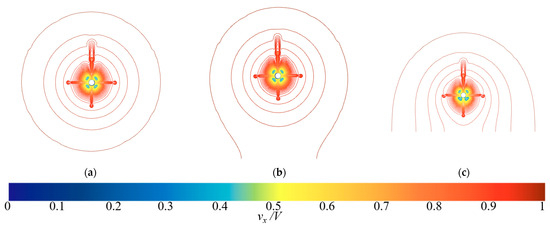 The comparison results of velocity components in three directions at the circumferential position of r/R = 0.25 on the propeller disk under the three cases of H = 0.1 L, 0.2 L, and 0.5 L are presented in Figure 14. Figure 14 shows that the velocity components in the x and y directions are relatively small within the range of 0° to 90°, while that in z-direction is relatively small within the range of 0° to 60° under the three cases. This is because, by definition, the range of 0° to 90° for the propeller disk is above the horizontal stern appendages, and the calculation only changes the H, so there is almost no influence on the flow field within this range. Figure 14a shows that, within the range of 100° to 180°, the velocity components in the x-direction decrease noticeably as H continuously decreases. When H = 0.1 L, they decrease the most at around 120°, by approximately 0.076; when H = 0.2 L, they decrease the most at around 135°, by approximately 0.049. In the range of 100° to 160°, there is some wiggle, which is caused by the lack of monitoring points in this area due to the scale of this grid cell not being small enough. Figure 14b shows that, within the range of 90° to 120°, the velocity components in the y-direction only decrease slightly as H continuously decreases. When H = 0.1 L, they decrease the most at around 118°, by approximately 0.012; when H = 0.2 L, they decrease the most at around 109°, by approximately 0.010. Within the range of 120° to 180°, the velocity components in the y-direction increase as H decreases. When H = 0.1 L, they increase the most at around 128°, by approximately 0.036; when H = 0.2 L, they also increase the most at around 128°, by approximately 0.016. The curve for H = 0.1 L is not very smooth around 120°, which may be due to the near-bottom advancing at this condition, and the existence of the bottom causes a drastic change in the wake flow near here. Figure 14c shows that, within the range of 60° to 150°, the velocity components in the z-direction decrease slightly as H continuously decreases. When H = 0.1 L, they decrease the most at around 149°, by approximately 0.014; when H = 0.2 L, they decrease the most at around 149°, by approximately 0.002. In conclusion, changing H may only have a minor impact on the velocity components of the lower part of the UV.