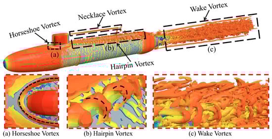 To further grasp more detailed data and vortex structures in the wake, an LES was employed to conduct the calculation. Figure 17 shows the vortex structures around DARPA SUBOFF, which were identified and extracted using a normalized iso-surface (Q = 5), and a streamwise velocity distribution is demonstrated on the vortex structures. It can be observed that there are three main types of vortex structure near the hull: a horseshoe vortex, a hairpin vortex, and a wake vortex. The horseshoe vortex is generated at the junction of the sail and the hull, and it flows downstream in the form of a high-intensity U-shaped structure. Hairpin vortices can be seen on both sides behind the horseshoe vortex, and their velocities are highly unstable. Moreover, under the interaction between the horseshoe vortex and the hairpin vortex, the hairpin vortex will continuously bend and deform as it develops along the moving direction. Meanwhile, a complex wake vortex structure can be captured at the stern of the UV; its shape is similar to that of the hairpin vortex, and its velocity is also extremely unstable. Additionally, a vortex structure resembling a necklace gradually detaches from the top of the sail and dissipates backward along the moving direction. In conclusion, there are various complex vortex structures around the hull and in the wake region, and their shape and velocity properties are constantly changing.