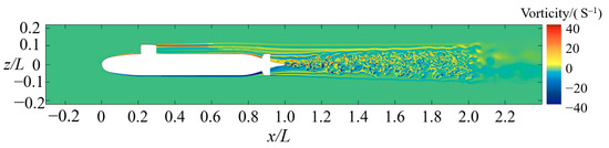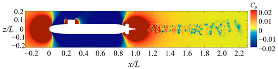 Figure 18 and Figure 19 present the vorticity distribution and Cp distribution in the UV’s mid-transverse section, respectively. By comparing the two, it can be observed that there is no chaotic flow condition in the hull area due to the small disturbance of the UV’s droplet-like shape in the flow field, and the vorticity distribution in the flow field is relatively orderly and exhibits a strip-like shape behind the sail. The Cp distribution exhibits a similar variation pattern as described in Section 4.1. In the region of x/L = 1.0–2.0 behind the hull, influenced by the hull and the stern appendage, the vorticity distribution in the flow field becomes chaotic and a large number of vortices are formed. Correspondingly, the Cp distribution becomes disordered, with positive and negative pressures appearing alternately.