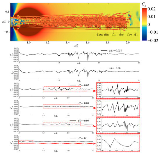 To explore the relationship between the hydrodynamic pressure field and the wake field in more detail, the hydrodynamic pressure field behind the hull was monitored at different water depths within the region of x/L = 1.0–2.5. The data were processed to determine the fluctuations in the hydrodynamic pressure field at different depths, as shown in Figure 20. It is shown that any pressure fluctuation curve initially shows a downward trend, and then fluctuations only emerge near x/L = 1.1. In combination with Figure 19, it can be understood that when the hydrodynamic pressure field has just left the hull region, it is mainly influenced by the hull and some high-pressure areas are still present. After gradually moving away from the hull region, the wake disturbance becomes the primary factor affecting the hydrodynamic pressure field. As the flow distance increases, the fluctuation ranges of the curves, except for the z/L = −0.1 curve, are concentrated in the interval of x/L = 1.5~2.2, suggesting that the wake in this part is the most complex and has a relatively high energy. Additionally, since the monitoring position of the z/L = −0.1 curve has gradually moved away from the wake center region, the fluctuation in the hydrodynamic pressure field affected by the wake is no longer evident. Instead, the pressure in the interval of x/L = 1.0~1.25 is more noticeably affected by the high-pressure region at the tail.