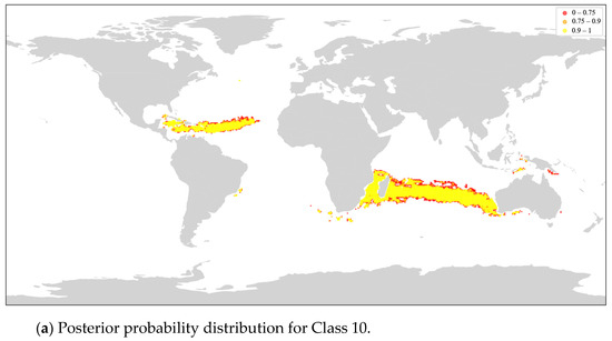 Figure 9 illustrates that Class 10 exhibits low posterior probabilities primarily along the region’s edges, where it competes with adjacent classifications. Meanwhile, Class 11 is situated in the Western Pacific Warm Pool near the Peru Current, an area characterized by temperature instability that results in reduced posterior probabilities. Class 16 comprises warm water masses adjacent to the cold water masses of Class 8. Additionally, lower posterior probabilities are observed in the northeastern corner, where the Gulf Stream’s influence weakens at higher latitudes and the surrounding cold currents further contribute to the sea temperature instability.
