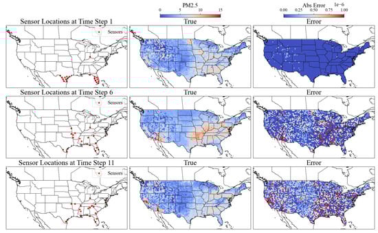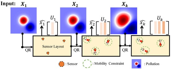 The rational placement of pollutant monitoring sensors has long been a prominent research focus in ocean environment science. Our method integrates an incremental Proper Orthogonal Decomposition with a mobility-constrained sensor selection strategy, enabling efficient monitoring and dynamic adaptation to spatio-temporal field changes. At each time step, the position of the sensors is updated based on the incoming measurements to minimize the reconstruction error while adhering to movement constraints. This online approach considers the need for mobility distance, making it suitable for long-term deployments in resource-limited scenarios. The proposed framework is validated in three scenarios: a linear advection–diffusion system with multiple moving pollution sources, the distribution of particulate matter with an aerodynamic diameter smaller than 2.5 μm (PM2.5) across the United States, and scalar transport in flows past side-by-side cylinder arrays in the ocean. The results demonstrate that the method achieves high reconstruction accuracy with significantly fewer sensors. This study conducts a comparative analysis of three typical mobility constraints and their respective effects on reconstruction accuracy. In addition, the proposed localized sensor mobility strategy effectively tracks evolving plume structures and maintains a low approximation error, providing a generalizable solution for sparse monitoring of the marine environment. Full article
