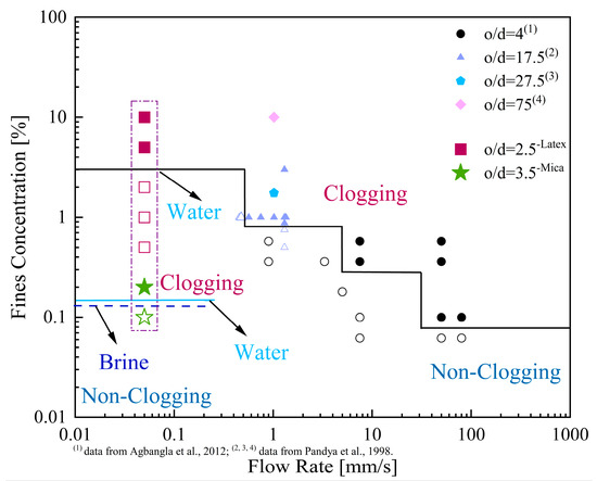 Fines migration and clogging in porous media have significant implications for engineering applications. For example, during the extraction of marine gas hydrates, fines migration can lead to pore clogging and reduced permeability. This study combines micromodel experiments with DEM-CFD simulations to investigate the effects of fine type (latex/mica), fine shape (spherical/flake), pore size (50 to 700 μm), and pore fluid composition (DW/brine) on fines migration, fine clogging behavior, and the evolution of host sediment porosity. Experiments demonstrate that clogging is geometrically influenced by the relationship between pore size and fines dimensions. Even when the size of fines (mica) is smaller than the pore throat size, their aggregates can still lead to clogging at very low concentrations (0.1–0.2%). The aggregate size of irregular mica is affected by changes in pore fluid properties, which may occur due to the freshening of pore water during hydrate dissociation. Furthermore, a moving gas/liquid interface concentrates fines, thereby increasing the risk of pore clogging. Simulations further reveal that fines migration causes dynamic changes in porosity, which requires a comprehensive consideration of the coupled effects of fine type, fluid velocity, pore size, and fluid chemistry. This study elucidates the microscopic mechanisms and quantifies the macroscopic effects of fines migration behavior in porous media, providing a theoretical foundation for further research. Full article