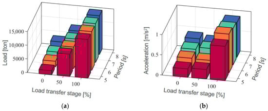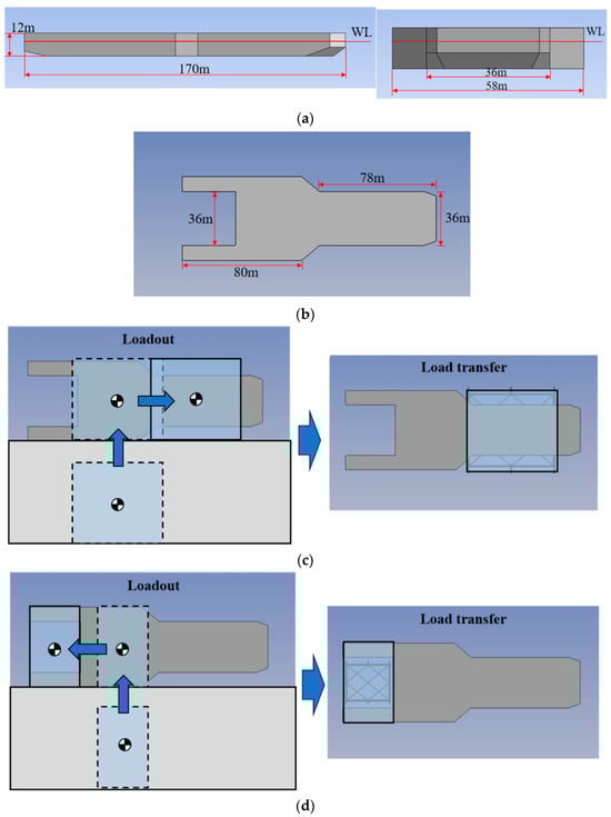 To address the current lack of specialized equipment for offshore wind platform installation and the unresolved challenges in deploying large offshore converter stations, this paper proposes a novel T–U-shaped barge for large offshore wind structures. First, a hydrodynamic model of the T–U-shaped barge is constructed and analyzed in ANSYS-AQWA. The influence of resonance occurring in the gap at the U-shaped stern on the frequency-domain model of the T–U-shaped barge is investigated. Subsequently, two installation configurations are examined: loading at the bow and loading at the stern of the T–U-shaped barge. This study comprehensively considers key components of the float-over installation system, including leg mating units (LMUs), deck support units (DSUs), fenders, and mooring cables. The results show that, for both installation schemes, the dynamic load distribution on each LMU evolves as the load-transfer stage progresses, and the sensitivity to wave period varies across different load-transfer stages, even under the same operating condition. This study evaluates the performance of the proposed T–U-shaped barge in the float-over installation of large offshore converter stations, demonstrating that its distinctive configuration endows it with strong functionality and provides valuable references for optimizing offshore wind-structure installation methods, as well as for the design and manufacturing of installation equipment. Full article