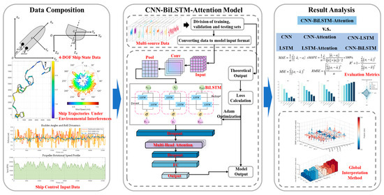 The proposed hybrid model integrates a convolutional neural network, bidirectional long short-term memory network, and attention mechanism. This model is applied to the nonparametric system identification of ship motion, incorporating wind factors. The model processes input data with different historical dimensions after preprocessing, extracts local features using a CNN layer, captures bidirectional temporal dependencies via a BiLSTM layer to provide comprehensive bidirectional information, and finally introduces a multi-head attention mechanism to enhance the model’s expressive and learning capabilities. However, the use of deep neural networks introduces difficulties in explaining internal mechanisms. The coupled CNN-BiLSTM-Attention model with SHapley Additive exPlanations was adopted for the prediction of ship motion processes and the identification of key input feature factors. The effectiveness of the proposed model was validated through experiments using a ship free-running motion dataset with wind interference. The findings indicate that, in comparison to conventional single-architecture models and composite architecture models, the proposed model attains smaller prediction errors and demonstrates augmented generalizability and robustness. Full article