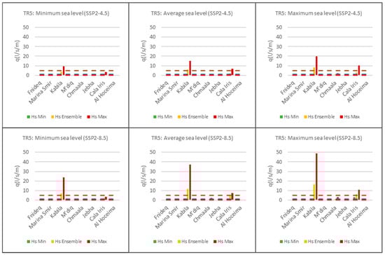 This study examines the impact of climate change on wave overtopping discharge (q) at eight Moroccan Mediterranean ports, under climate scenarios SSP2-4.5 and SSP5-8.5, projected to the year 2100. To address inter-model variability and better represent future conditions, wave data from four different models were used. The analysis considers three return periods—1, 5, and 25 years—and includes both central estimates and values from the 90% confidence intervals to assess uncertainty from sea level rise (SLR) and wave projections. Results show that overtopping discharges increase with return period, along with the number of ports affected. At 1 year, two ports exceed tolerable thresholds; at 5 years, three ports are impacted; and at 25 years, nearly all ports face overtopping risks. When varying SLR while holding wave height (Hs) constant, discharge variations remain within one order of magnitude. However, when varying Hs with constant SLR, variations span two to three orders of magnitude. These results suggest that accurate Hs projections are more critical than SLR in estimating overtopping risk, emphasizing the need to reduce wave forecast uncertainty to support climate adaptation strategies. Full article